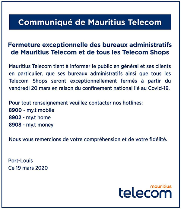 Les bureaux administratifs et les Telecom Shops seront fermés à partir de ce vendredi 20 mars, en raison du confinement lié au Covid-19, décrété hier.