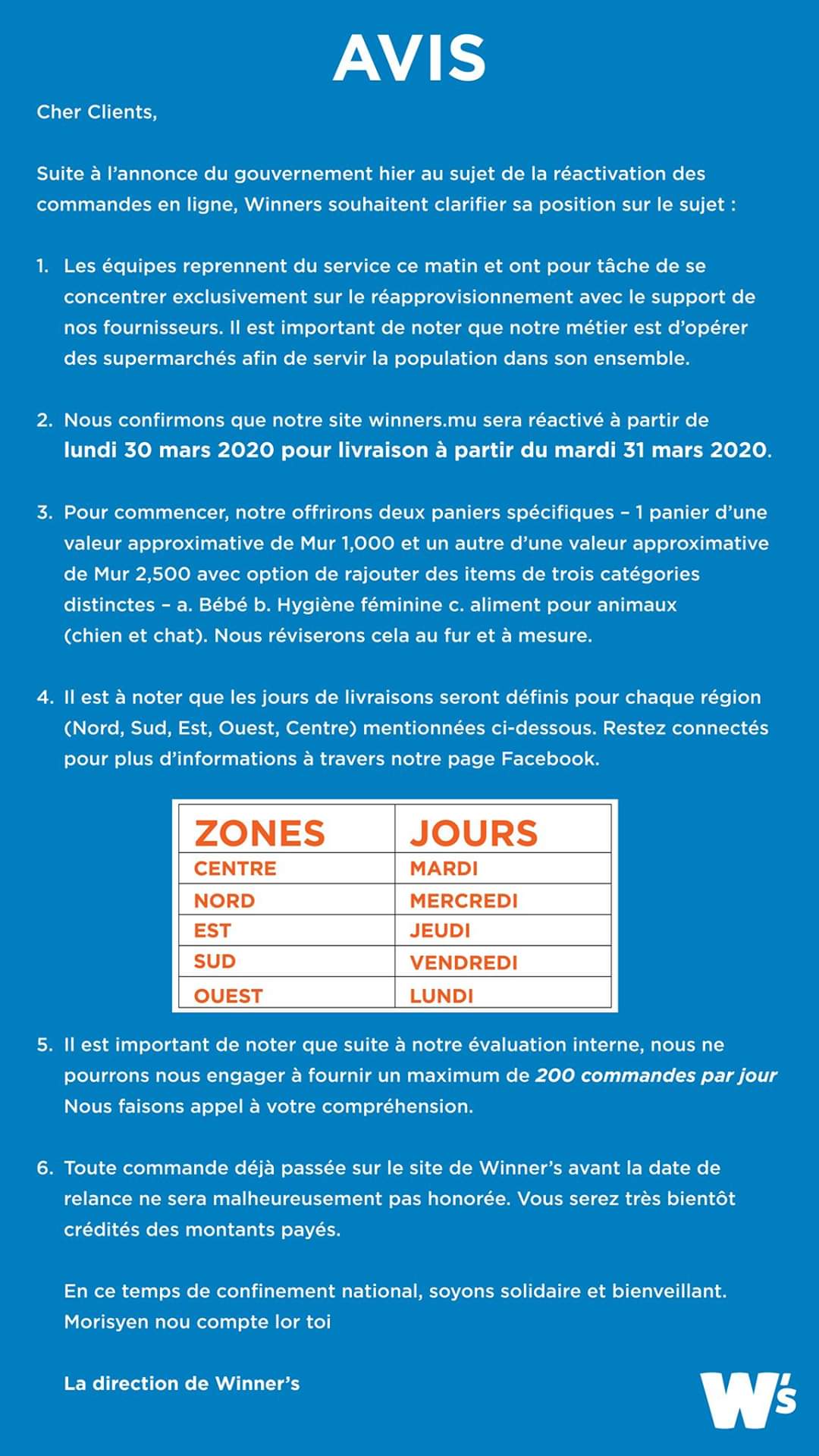 La chaîne de supermarchés Winner’s a émis un communiqué pour informer le public que son site sera réactivé le lundi 30 mars pour les commandes. Les premières commandes seront livrées le lendemain.