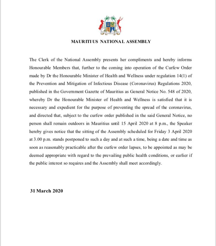 Le suspense a pris fin dans l’après-midi de ce mercredi 1er avril. Les travaux parlementaires, qui avait été ajournés au vendredi 3 avril, ont été repoussés à une date ultérieure. C’est ce qui ressort d’une correspondance de la Clerk de l’Assemblée Nationale aux parlementaires.
