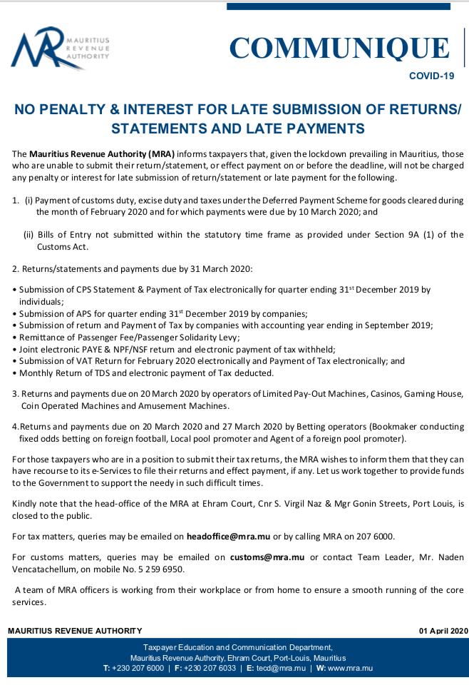 Ceux qui ne peuvent soumettre leur fiche ou paiement au plus tard à la date butoir ne paieront pas de pénalité ou d’intérêt. C’est ce qu’indique la Mauritius Revenue Authority (MRA) à travers un communiqué émis ce mercredi 1er avril 2020. La décision concerne le paiement des droits de douane, des droits d’accises et la taxe sur le Deferred Payment Scheme pour les marchandises pendant le mois de février 2020 et pour lesquels les paiements étaient dus au 10 mars 2020.