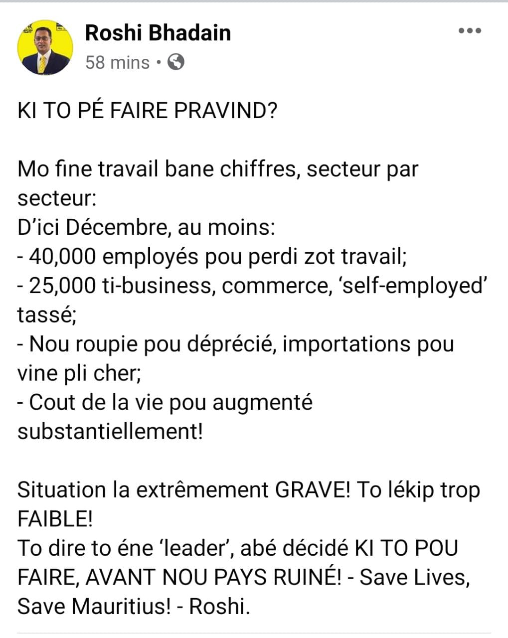 Post-Covid-19: «Save lives, save Mauritius» lance Roshi Bhadain au PM