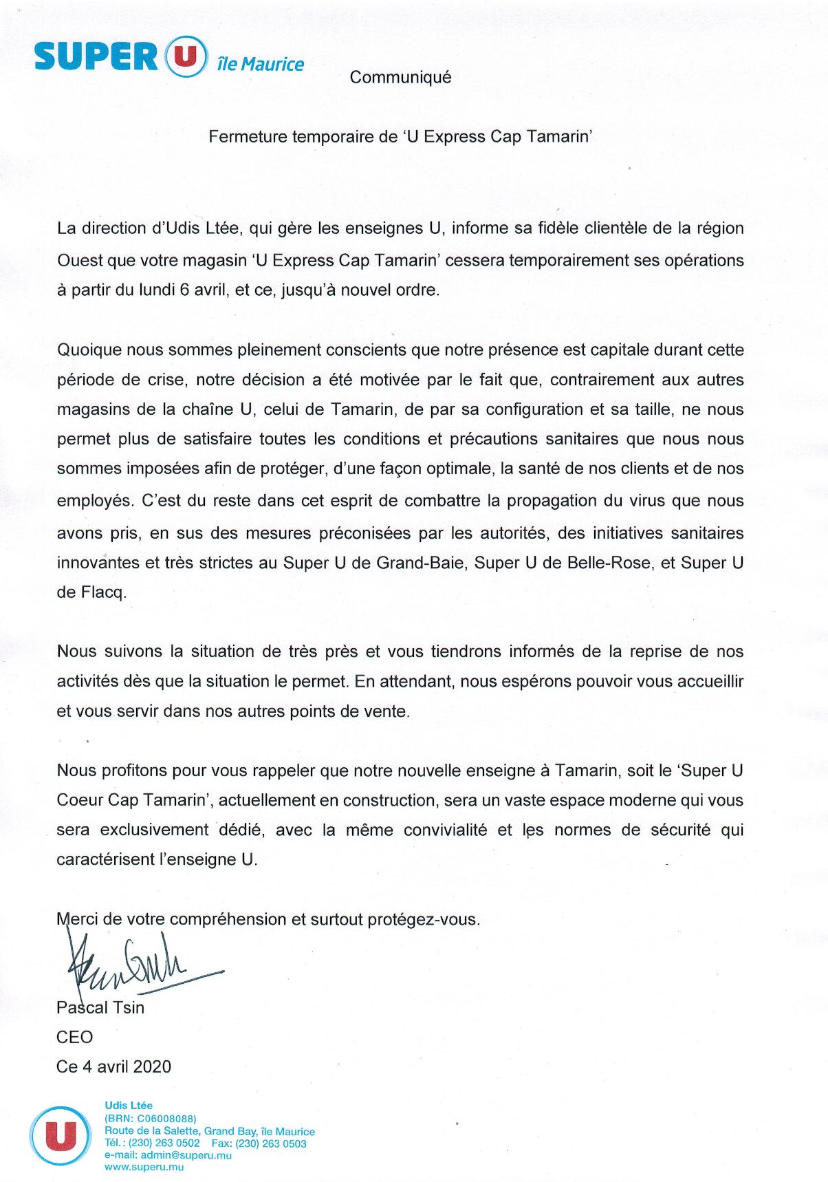 Pascal Tsin fait ressortir, dans le communiqué - voir ci-joint - que «nous sommes pleinement conscients que notre présence est capitale durant cette période de crise, notre décision a été motivée par le fait que, contrairement aux autres magasins de la chaîne U, celui de Tamarin, de par sa configuration et sa taille, ne nous permet plus de satisfaire toutes les conditions et précautions sanitaires que nous nous sommes imposées afin de protéger, d’une façon optimale, la santé de nos clients et de nos employés».