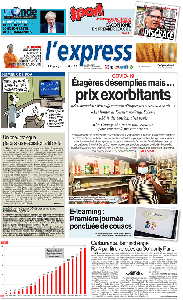 En une de l'express de ce mardi 7 avril: Covid-19: étagères désemplies mais … prix exorbitants ; Autre titre: Carburants: Tarif inchangé, Rs 4 par litre versées au Solidarity Fund.