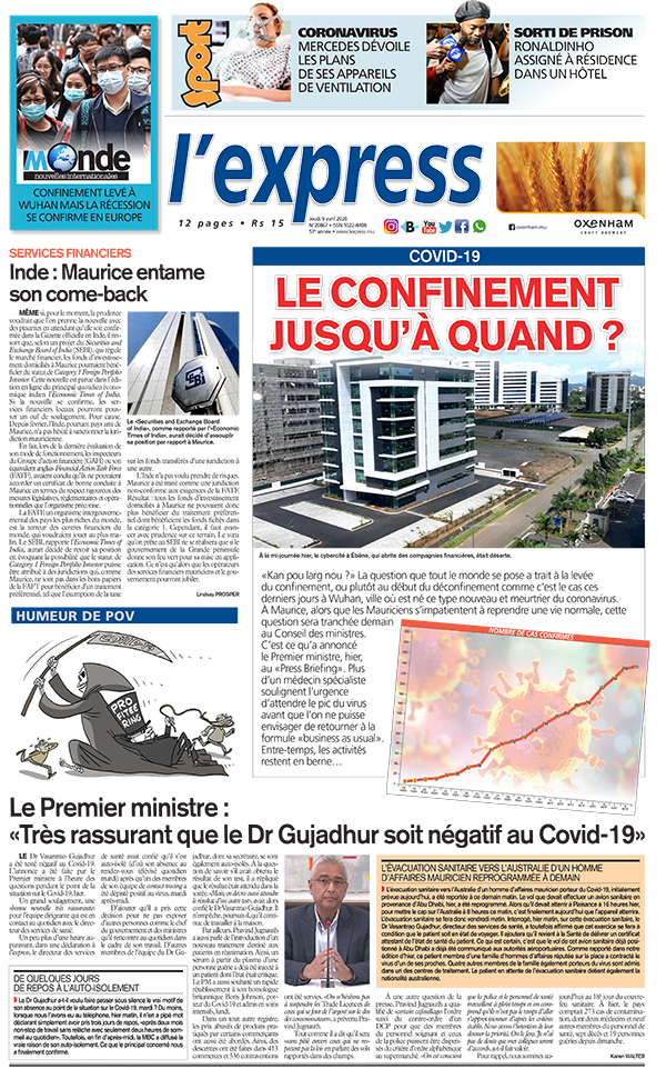 En une de l'express de ce jeudi 9 avril ; Covid-19: le confinement jusqu’à quand ? Autre titre ; Le Premier ministre: «Très rassurant que le Dr Gujadhur soit négatif au Covid-19.