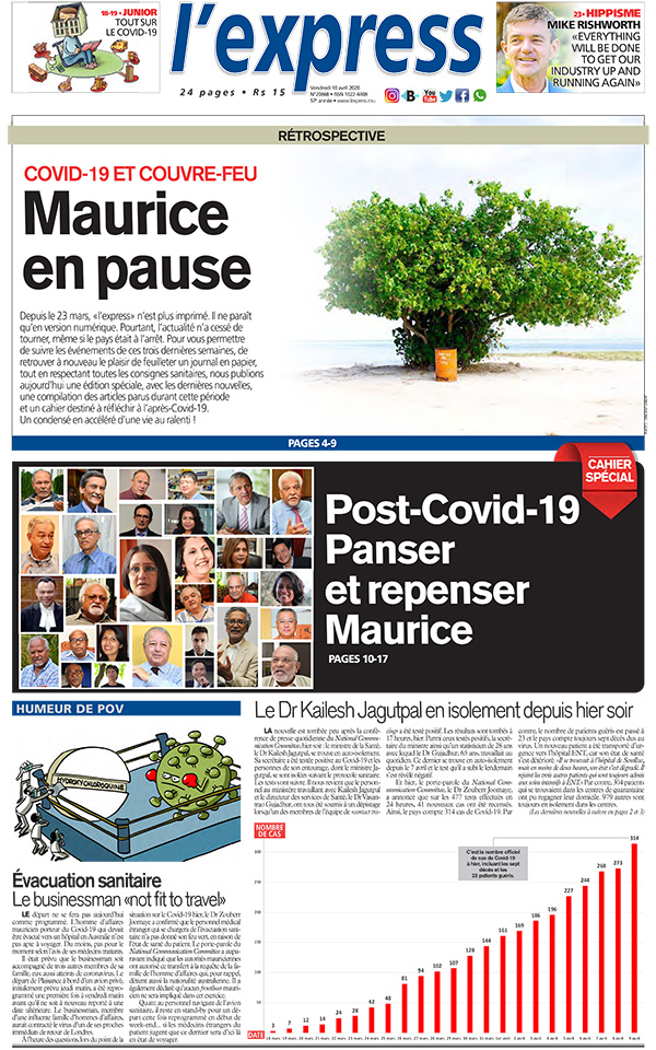 En une l'express de ce vendredi 10 avril ; Covid-19 et couvre-feu: Maurice en pause ; Autre titre ; Cahier Spécial: Maurice dans des scénarios post-Covid-19.