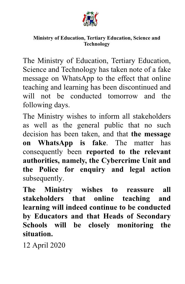 Attention aux fausses nouvelles! Un message circule sur les réseaux sociaux selon lequel l’enseignement en ligne ne se fera plus à partir d’une certaine date. Le ministère de l’Education affirme que c’est une fake news. Les cours se poursuivront comme cela se fait depuis la semaine dernière. Les autorités dont la Cyber Crime Unit ont été alertées. Une enquête a été ouverte pour retracer la personne derrière cette fausse information.