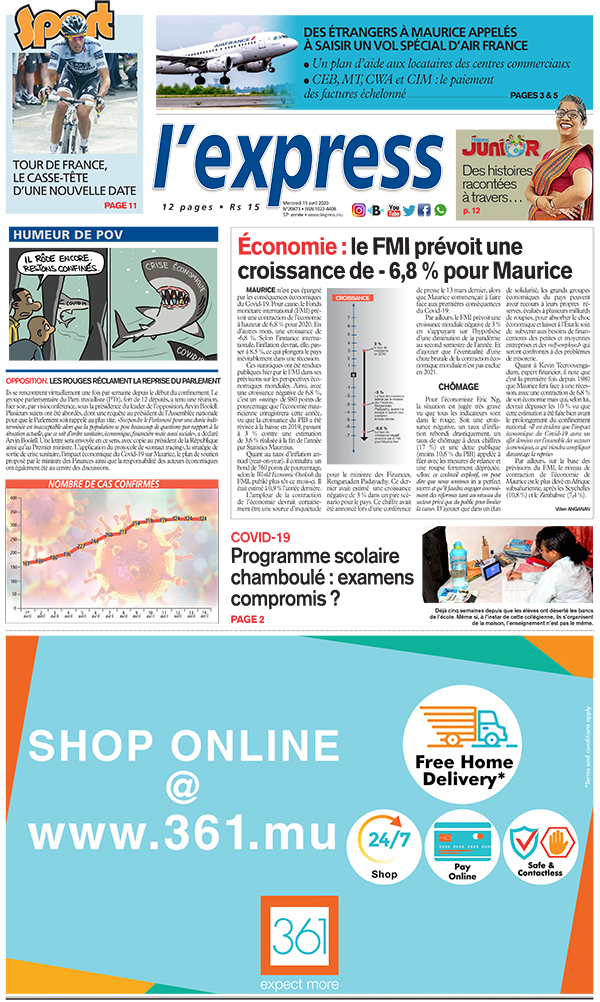 En une de l'express de ce mercredi 15 avril ; Économie: le FMI prévoit une croissance de - 6,8 % pour Maurice ; Autre titre: Covid-19: des étrangers à Maurice appelés à saisir un vol d’Air France.