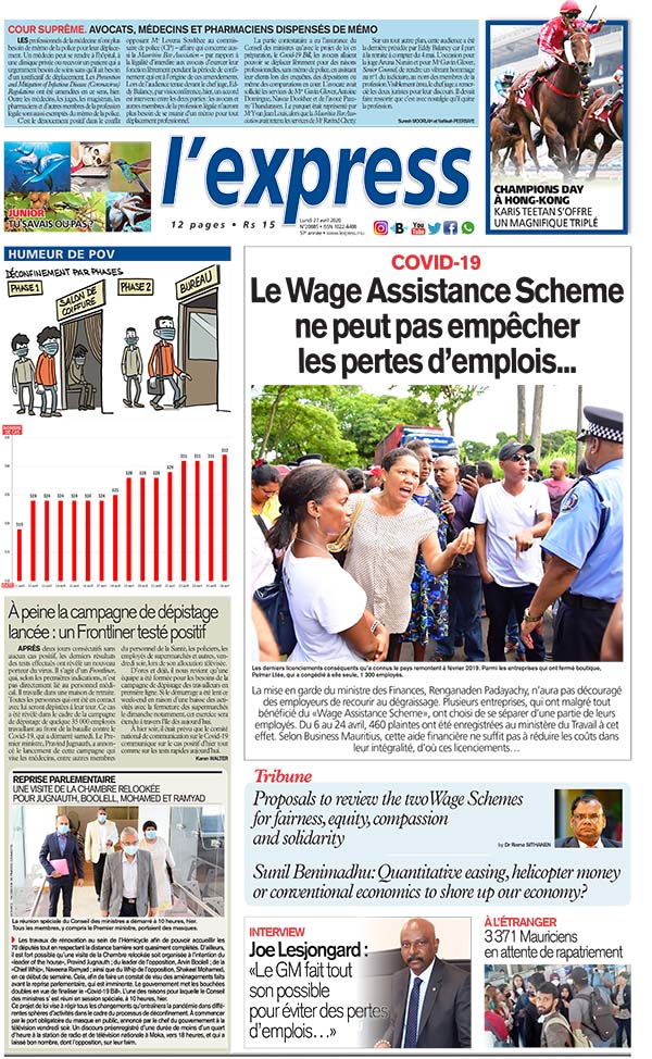 En une de l'express de ce lundi 27 avril : Covid-19: Le Wage Assistance Scheme ne peut pas empêcher les pertes d’emploi... Autre titre ; À peine la campagne de dépistage lancée: un Frontliner testé positif.