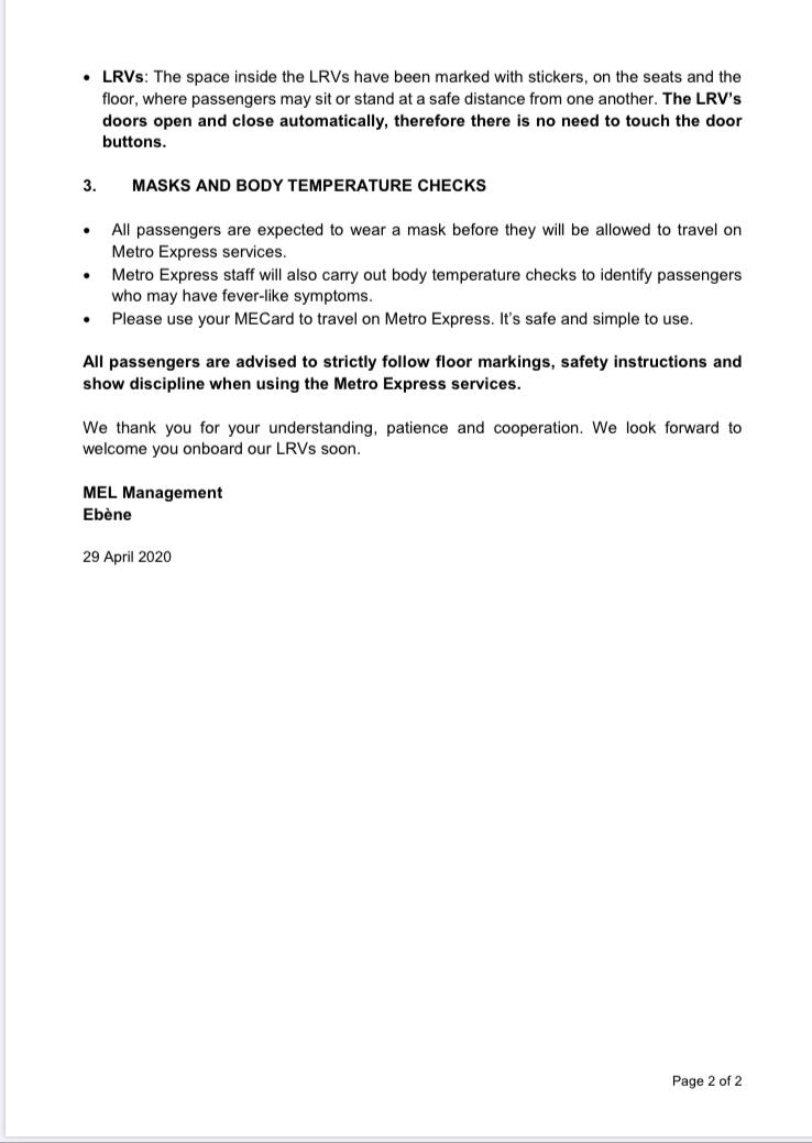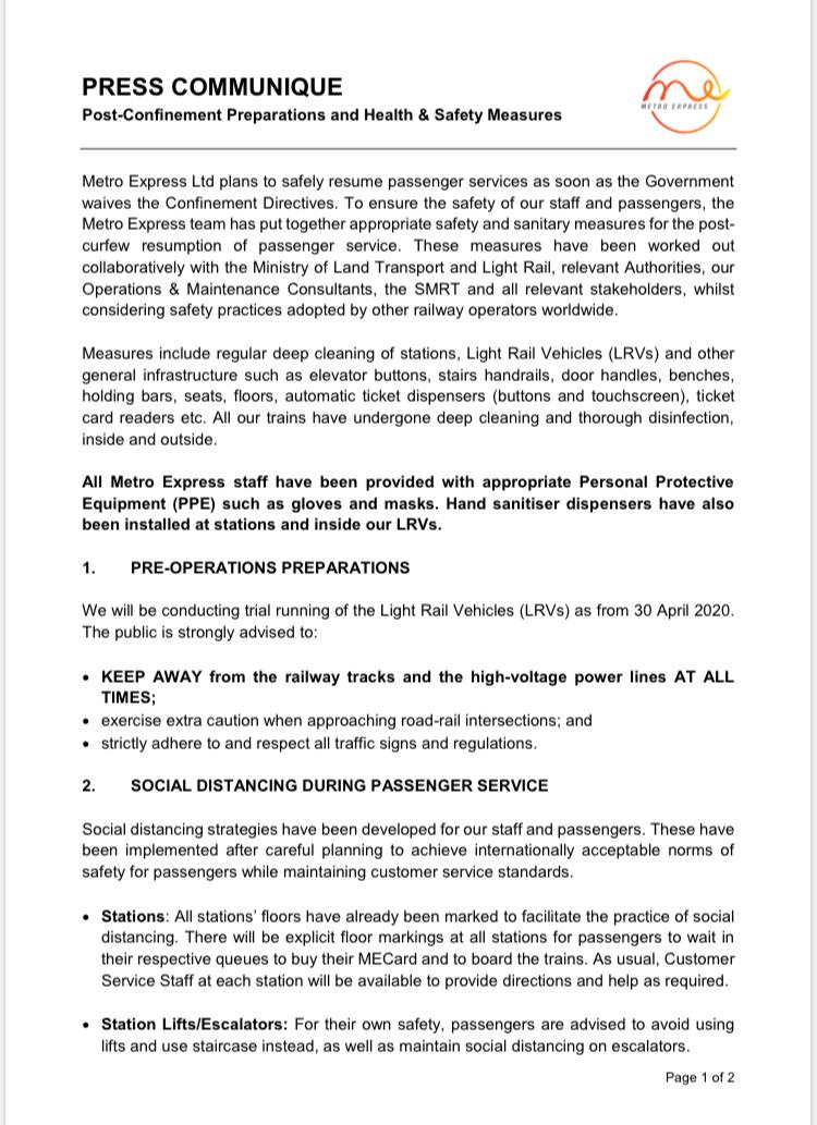 Avant la remise en service, les Light Rail Vehicles (LRV), les stations, tous les appareils et autres infrastructures ont été désinfectés. De plus, le port de masque sera obligatoire pour les passagers. Ces derniers seront soumis à une prise de température avant de pouvoir monter à bord. La distanciation sociale devra aussi être de rigueur et des marquages au sol ont été mis dans les stations et les LRV pour faciliter le respect de ce règlement.
