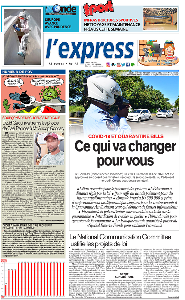 En une : Covid-19 et Quarantine Bill: ce qui va changer pour vous ; Autre titre : Soupçons de négligence médicale: David Gaiqui avait remis les photos de Caël Permes à Me Anoop Goodary.