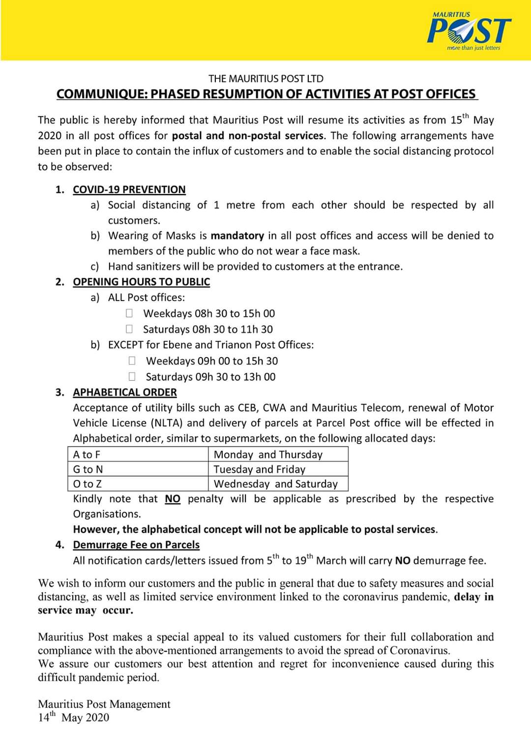 Les bureaux de poste seront à nouveau opérationnels demain, 15 mai. Cependant, le système d’ordre alphabétique en vigueur pour les supermarchés et autres commerces sera aussi applicable à la poste pour tous les services, que ce soit le paiement des factures, affranchir du courrier ou récupérer des colis.