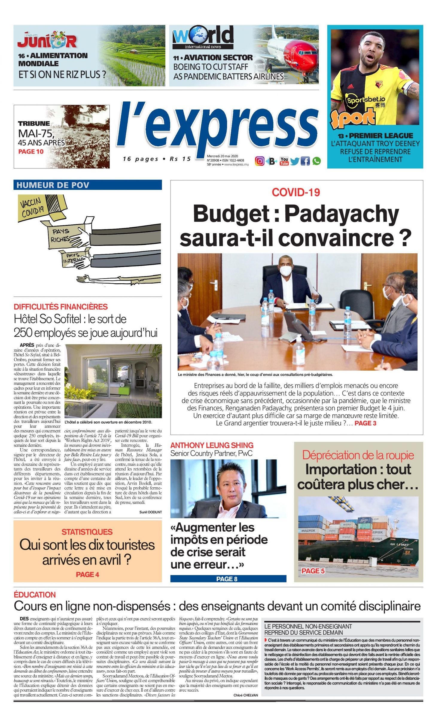 En une de l'express ce mercredi 20 mai 2020;Budget : Padayachy saura-t-il convaincre ? Autre titre;Hôtel So Sofitel : le sort de 250 employés se joue aujourd’hui.