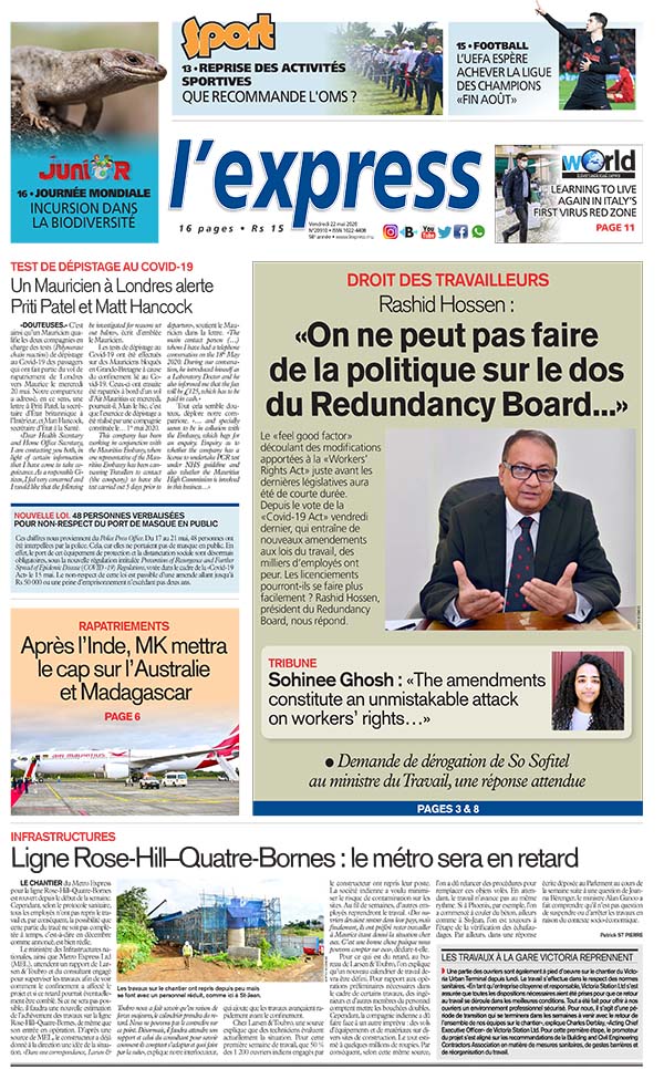En une de l'express: Rashid Hossen: «On ne peut pas faire de la politique sur le dos du Redundancy Board...» ; Autre titre: Ligne Rose-Hill–Quatre-Bornes: le métro sera en retard.