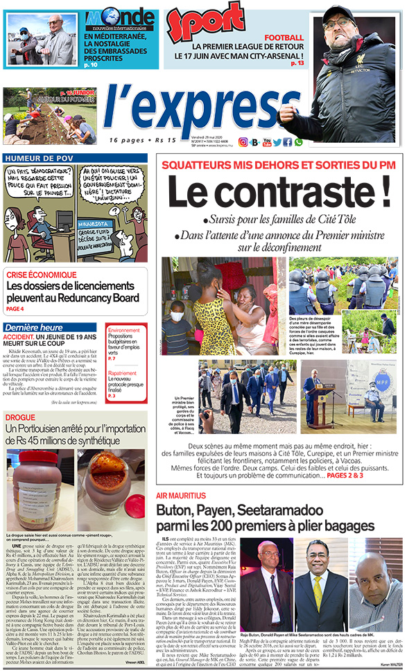 En une de l'express: Squatteurs mis dehors et sorties du PM: Le contraste ! Autre titre: Air Mauritius: Buton, Payen, Seetaramadoo parmi les 200 premiers à plier bagages.