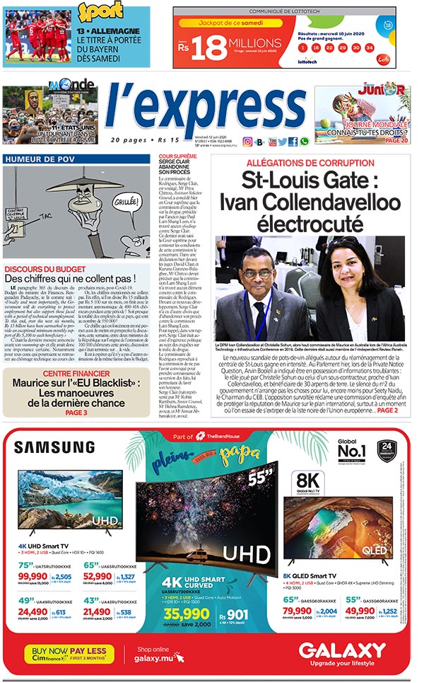 En une de l'express : St-Louis Gate: Ivan Collendavelloo électrocuté ; Autre titre : Discours du Budget: Des chiffres qui ne collent pas !