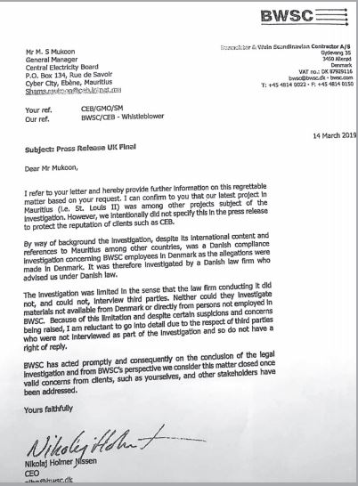 En attendant que les autorités mauriciennes parviennent à mettre la main sur le rapport d’investigation de la BAD sur les travaux à la centrale de St-Louis, une lettre du CEO de Burmeister & Wain Scandinavian Contractor (BWSC), qui circulent depuis quelques jours, vient alimenter la polémique. Dans le premier paragraphe, le CEO Nikolaj Holmer Nissen écrit ceci à S. Mukoon, ex-General Manager du CEB : «I can confirm to you that our latest project in Mauritius (i.e. St Louis II) was among other projects subject of the investigation. However, we intentionally did not specify this in the press release to protect the reputation of clients such as CEB.» Nous avons essayé en vain de solliciter une réaction du CEB par rapport à cette lettre qui est désormais du domaine public. Réagissant sur cette lettre, le PTr, par l’intermédiaire de Patrick Assirvaden, fait un appel au Premier ministre pour «sanctionner Ivan Collendavelloo afin de sauvegarder la réputation du pays».