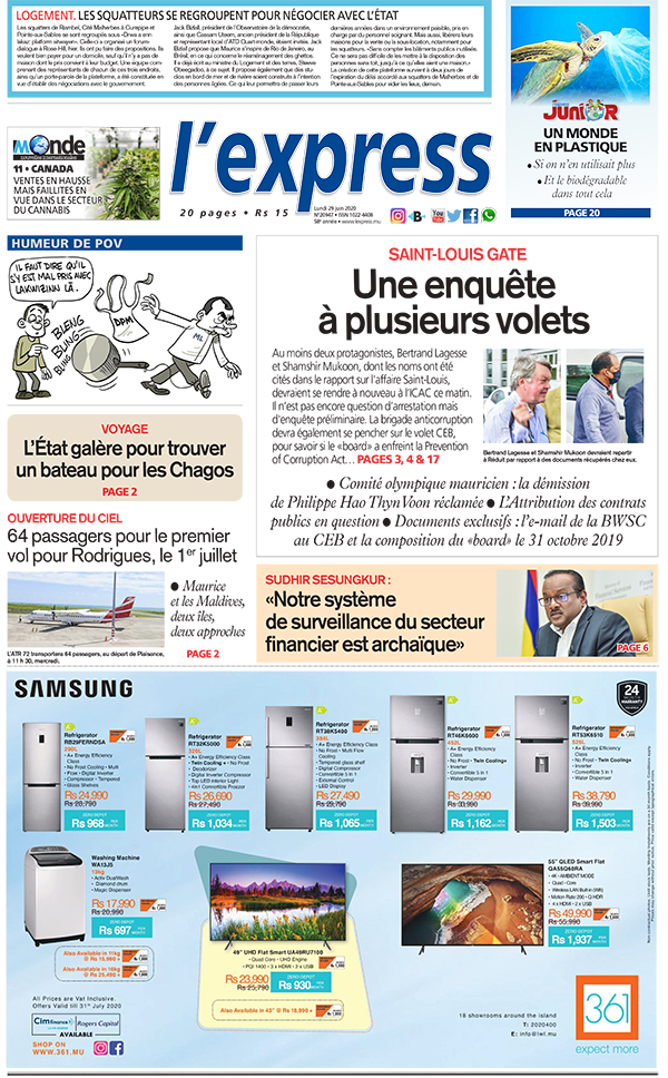 En une de l'express: Saint-Louis Gate: Une enquête à plusieurs volets ; Autre titre: Sudhir Sesungkur : «Notre système de surveillance du secteur financier est archaïque».