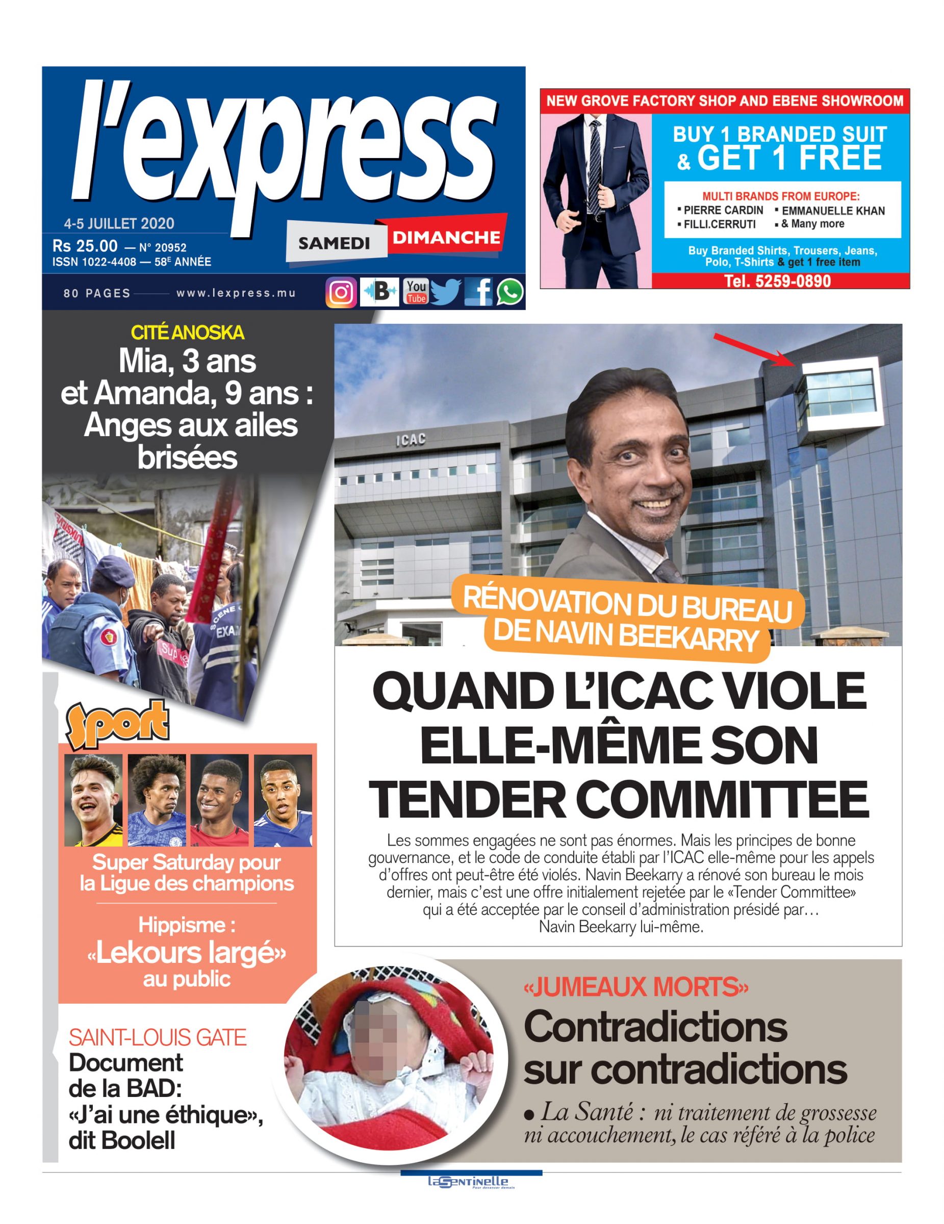 Votre journal deux en un de 80 pages en vente tout le week-end est en kiosque. Au coeur de l'actualité: l'ICAC rénove le bureau de Navin Beekarry,le scandale de la centrale St-Louis,Viol à Cité Anoska ou encore le mystère autour des «Jumeaux morts».