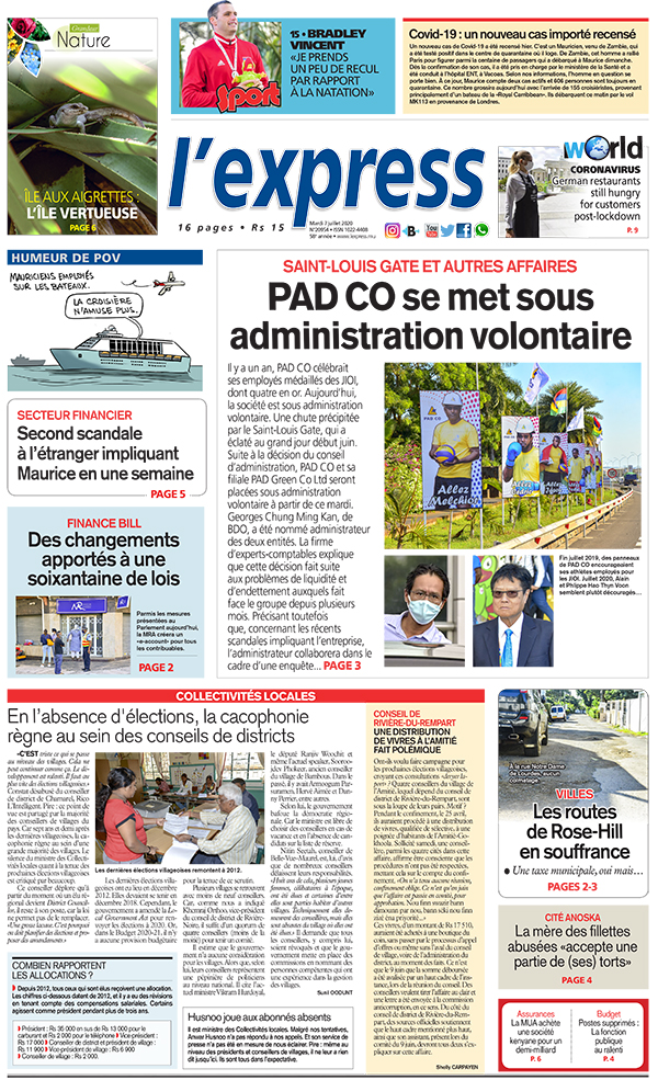 En une de l'express: Saint-Louis Gate et autre affaires: PAD CO se met sous administration volontaire ; Autre titre : Secteur financier: second scandale à l’étranger impliquant Maurice en une semaine.