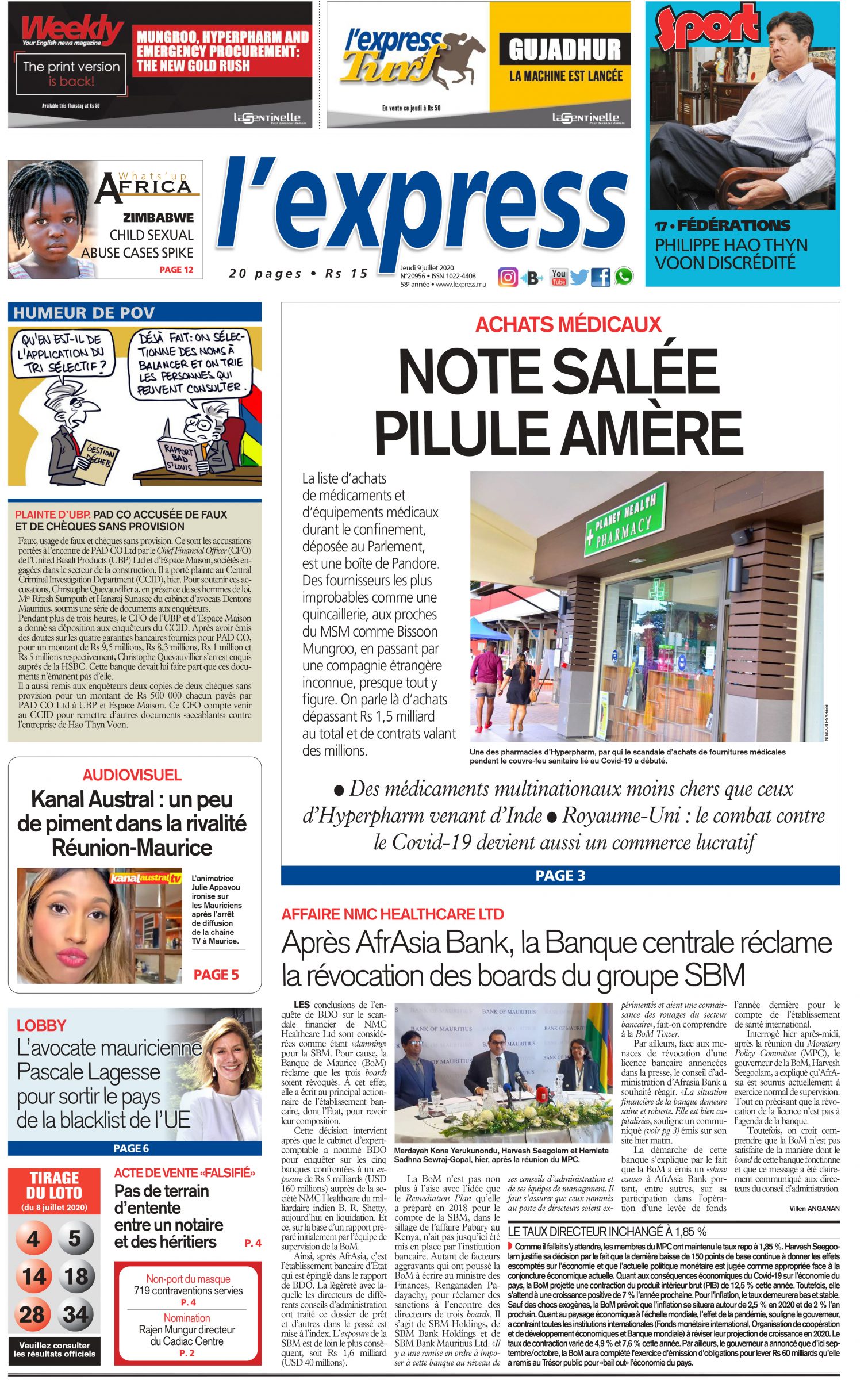 En une de l'express: Achats médicaux : note salée pilule amère ; Autre titre: Kanal Austral : un peu de piment dans la rivalité Réunion-Maurice.