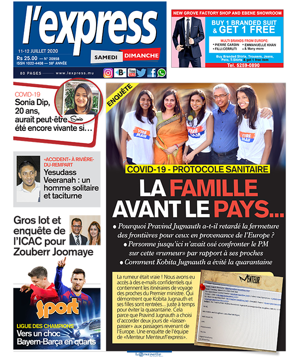 La rumeur était vraie ! Nous avons eu accès à des e-mails confidentiels qui contiennent les itinéraires de voyage des proches du Premier ministre. Qui démontrent que Kobita Jugnauth et ses filles sont rentrées... juste à temps pour éviter la quarantaine. Cela parce que Pravind Jugnauth a choisi d’accorder deux jours de «laisser-passer » aux passagers revenant de l’Europe. Une enquête de l’équipe de «Menteur Menteur/l’express».