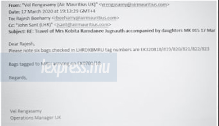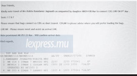 C’est au final ce que feront les Jugnauth, comme en témoigne un autre mél de Rajesh Beeharry. Le lendemain, le 17 mars, à 3 heures du matin, ce dernier écrit : «Mrs Kobita and daughters» ont annulé leur vol sur MK et rentreront par Emirates Airlines. Tout de même, les employés d’Air Mauritius qui travaillent à Heathrow à Londres, sont appelés à les assister. Et les employés de MK à Londres, même si Kobita Jugnauth ne voyage pas par Air Mauritius, feront comme il leur a été demandé, comme démontre le dernier mél de la série qui se lit comme suit :