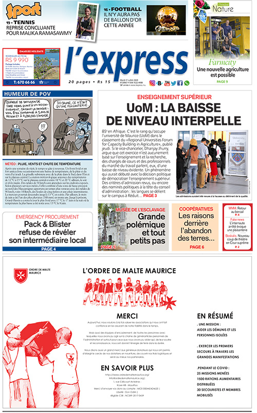En une de l'express: Enseignement supérieur-UoM: la baisse de niveau interpelle; Autre titre : Emergency procurement : Pack & Blister refuse de révéler son intermédiaire local.