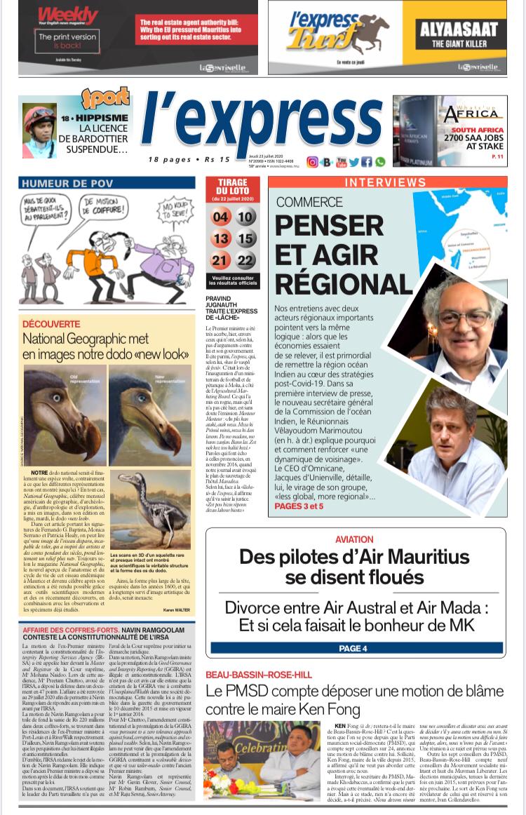 En une de l'express: Interviews : Commerce: penser et agir régional; Autre titre : Aviation: des pilotes d’Air Mauritius se disent floués.