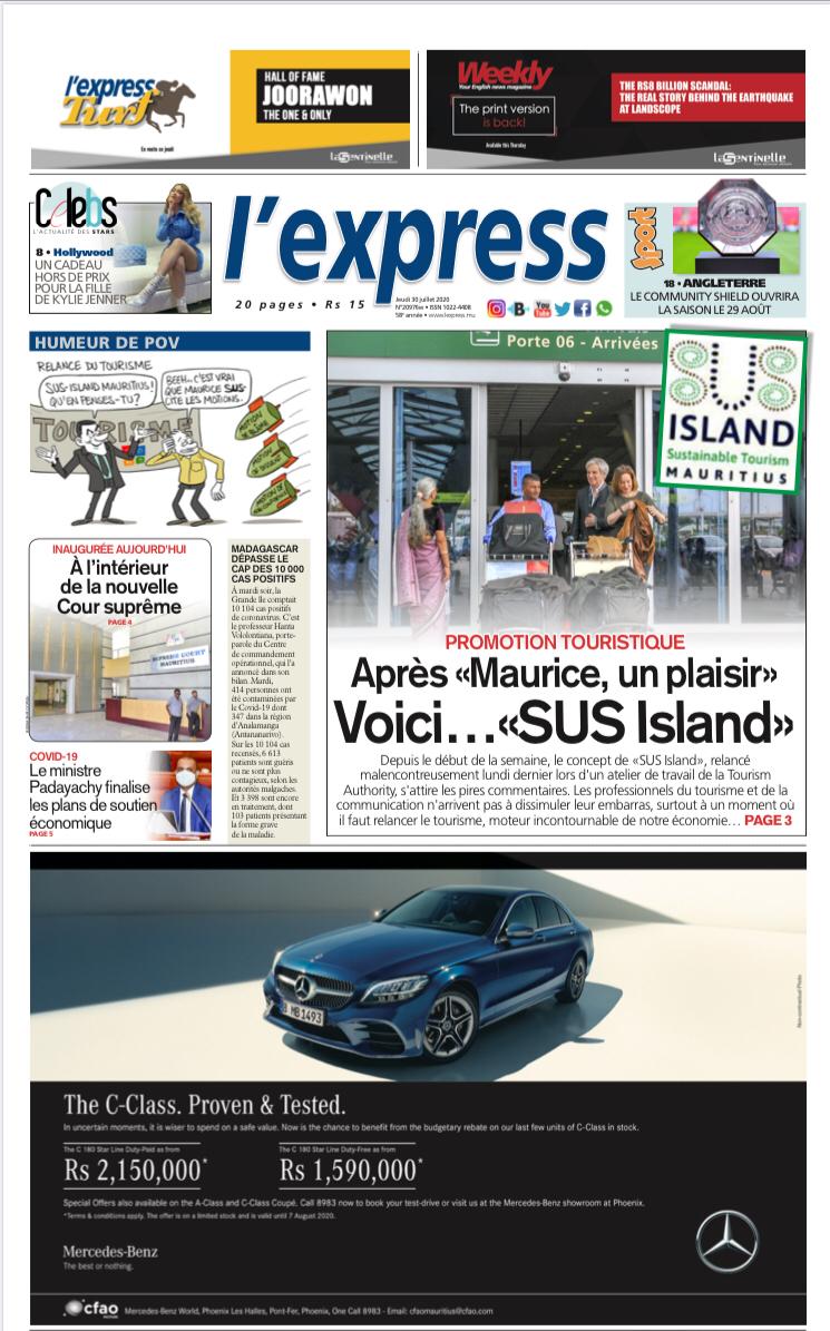 En une de l'express: Promotion touristique : Après «Maurice, un plaisir» Voici…«SUS Island» ; Autre titre : Inaugurée aujourd'hui : À l’intérieur de la nouvelle Cour suprême