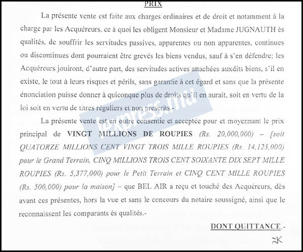 Il s’avère que le notaire Jérôme Koenig se dédouane en écrivant noir sur blanc que les Rs 20 millions ont été payées non seulement hors de sa «vue», mais également «sans son concours». Ce paiement a été fait selon l’acte, «dès avant ces présentes», terme technique utilisé pour décrire un événement antérieur à la rencontre entre le vendeur et l’acquéreur devant le notaire.