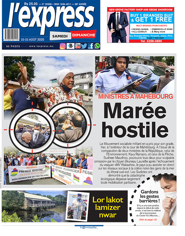 Votre journal deux en un de 80 pages en vente tout le week-end est en kiosque. Au coeur de l'actualité: «Ministres à Mahébourg: Marée hostile» , Autre titre ; Kushal Lobine: «Le capitaine du Wakashio est dévasté».