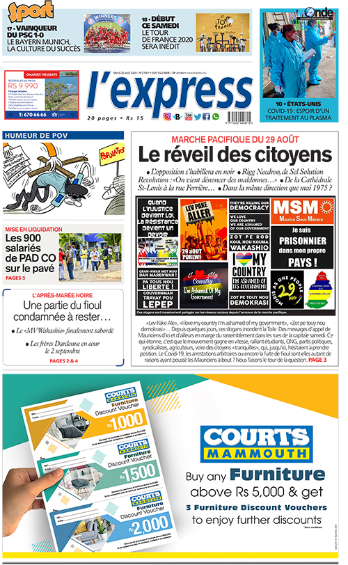 En une de l'express: Marche pacifique du 29 août : Le réveil des citoyens ; Autre titre : Mise en liquidation : Les 900 salariés de PAD CO sur le pavé.