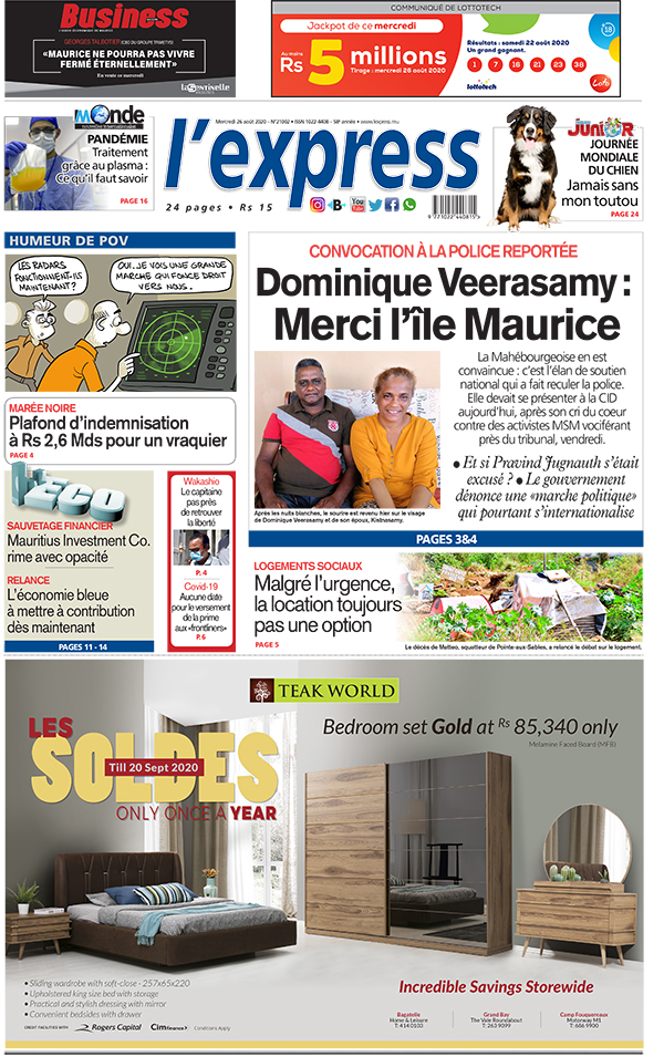 En une de l'express : Dominique Veerasamy: merci l’île Maurice ; Autre titre : Logements sociaux : la location toujours aux abonnés absents.