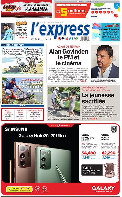 En une de l'express: Achat de terrain : Alan Govinden le PM et le cinéma; Autre titre : Dauphins échoués : Le bilan passe à 27 morts au moins.