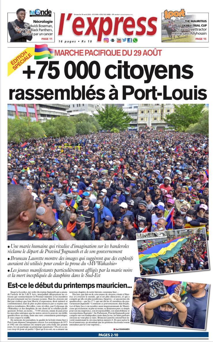 L'express sort ce dimanche 30 août exceptionnellement pour vous faire découvrir la foule bigarré et motivée de la marche pacifique du samedi 30 août à Port-Louis. Du jamais-vu.