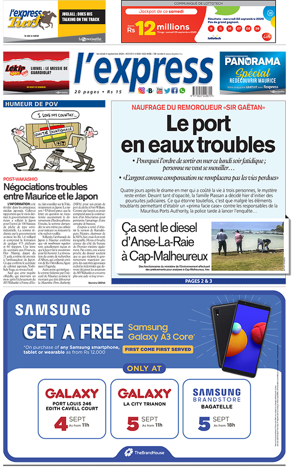 En une de l'express: Naufrage du remorqueur «Sir Gaëtan» : Le port en eaux troubles ; Autre titre : Post-Wakashio : Négociations troubles entre Maurice et le Japon.