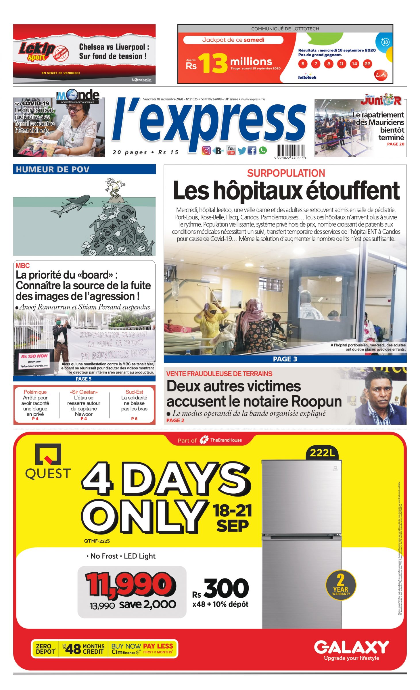 Les grands titres de l'express de ce vendredi 18 septembre 2020