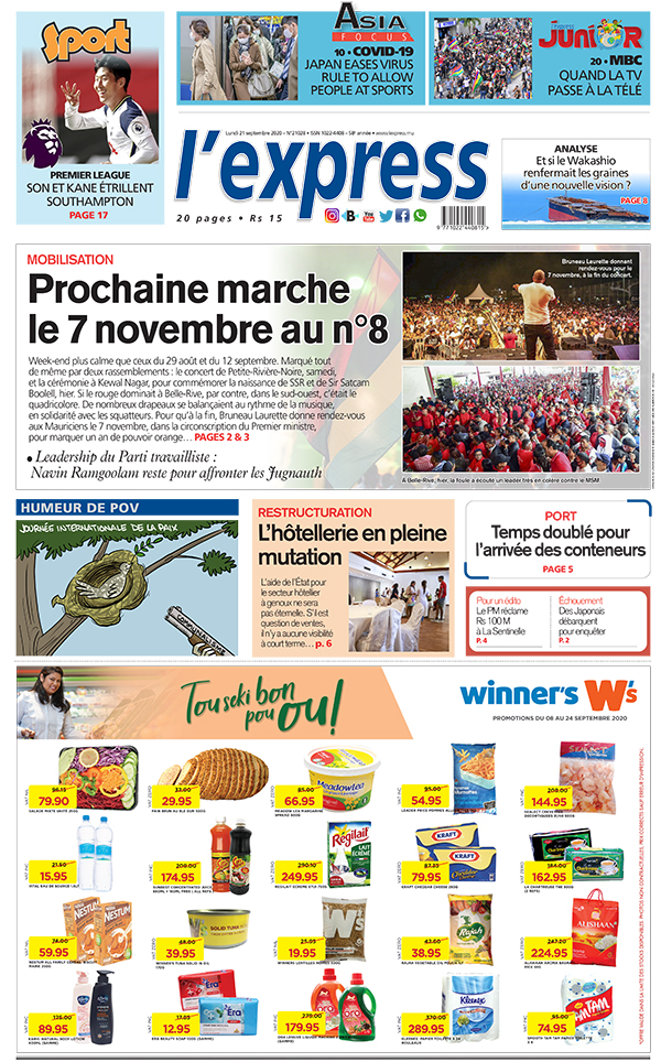 En une de l'express: Mobilisation: prochaine marche le 7 novembre au n°8 ; Autre titre: Leadership du Parti travailliste : Navin Ramgoolam reste pour affronter les Jugnauth.