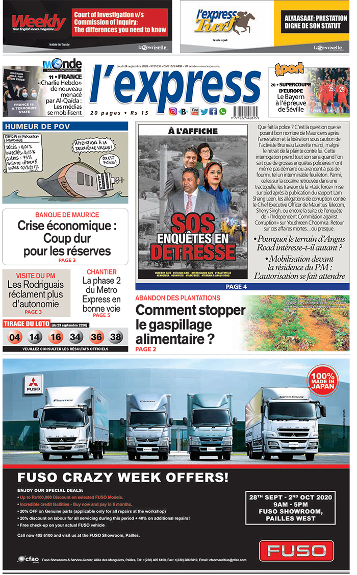 En une de l'express: Enquêtes policières en suspens : Ces affaires dont la suite nous échappe ; Autre titre : Banque de Maurice : Crise économique : Coup dur pour les réserves.