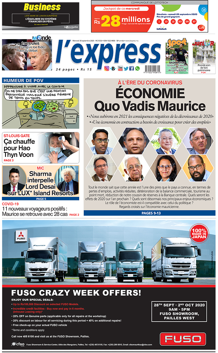 En une de l'express : À l'ère du coronavirus économie : Quo Vadis Maurice ; Autre titre : St-Louis Gate : Ça chauffe pour Hao Thyn Voon.
