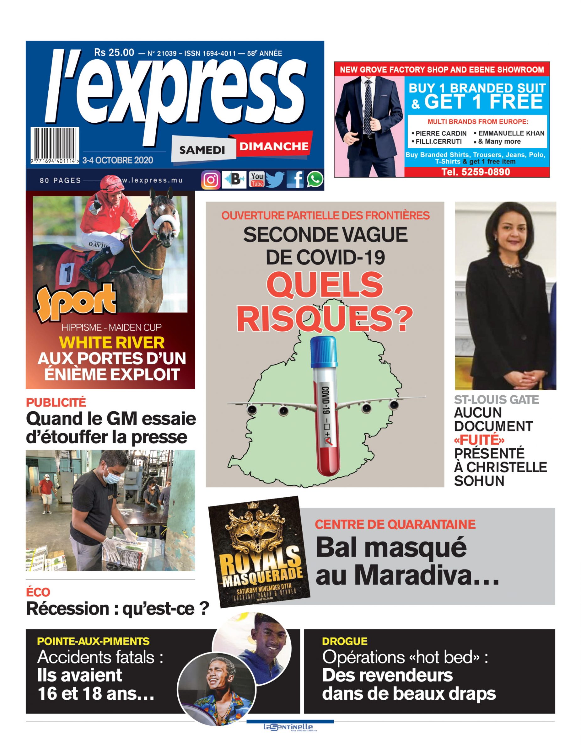 Votre journal deux en un de 80 pages en vente tout le week-end est en kiosque. Au coeur de l'actualité; Seconde vague de Covid-19: Quels risques?; Autre titre ; St-Louis Gate: aucun document «fuité» présenté à Christelle Sohun.