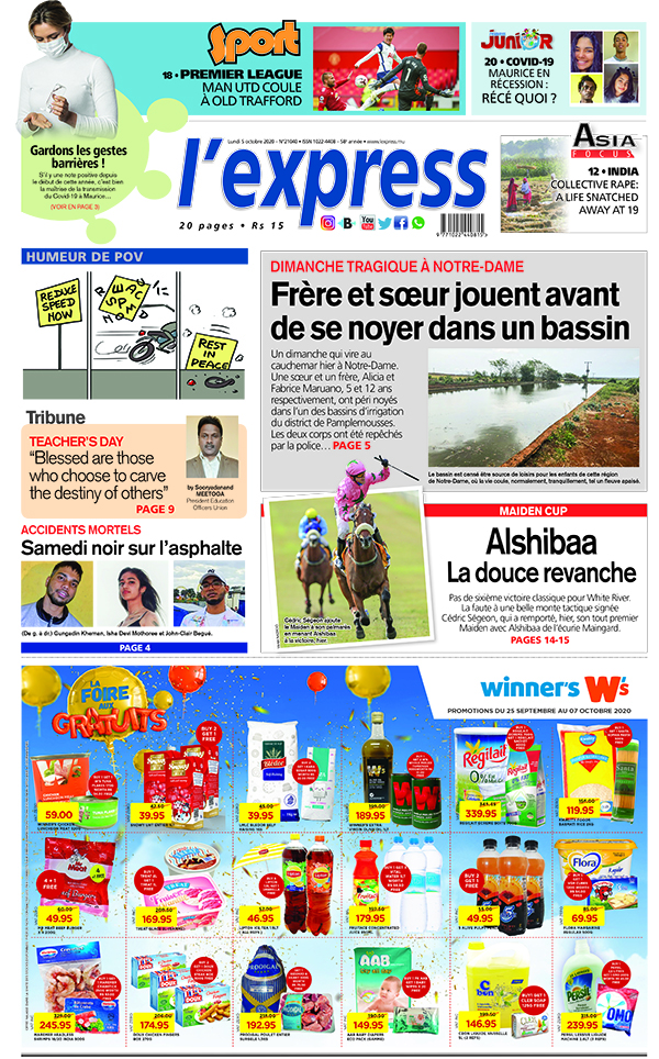 En une de l'express: Dimanche tragique à Notre-Dame: frère et soeur jouent avant de se noyer dans un basin ; Autre titre : Maiden Cup: Alshibaa, la douce revanche.