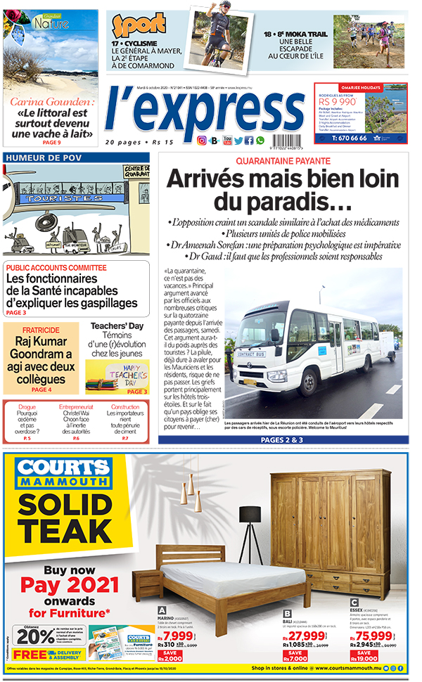 En une de l'express: Quarantaine payante: arrivés mais bien loin du paradis… Autre titre : Fratricide: Raj Kumar Goondram a agi avec deux collègues.