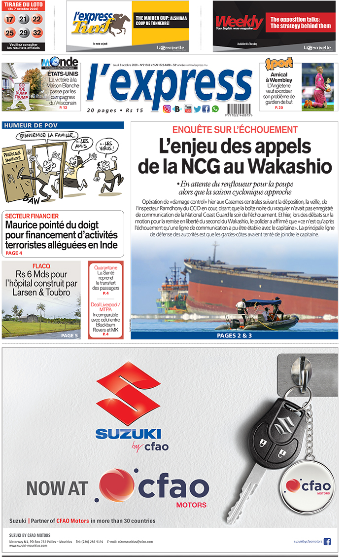 En une de l'express: Enquête sur l’échouement : L’enjeu des appels de la NCG au Wakashio ; Autre titre : Secteur financier : Maurice pointé du doigt pour financement d’activités terroristes alléguées en Inde.