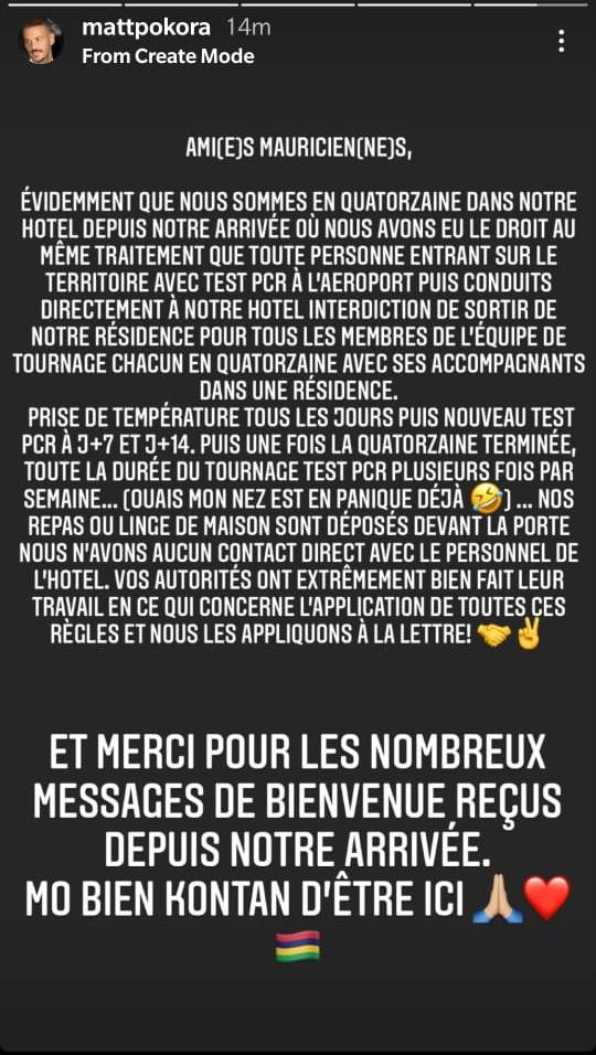 Dans son message, Matt Pokora soutient qu’il a reçu le «même traitement que toute personne entrant sur le territoire (NdlR, mauricien)». Il remercie en outre «[vos] autorités qui ont extrêmement bien fait leur travail (…)»