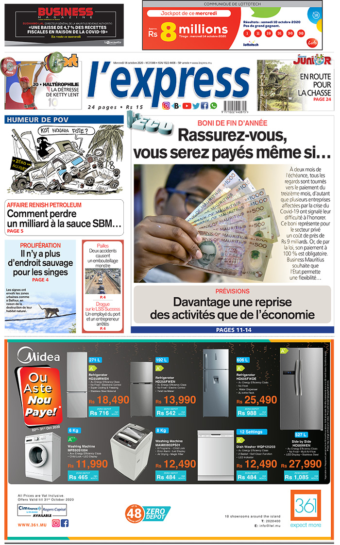 En une de l'express: Boni de fin d’année : Rassurez-vous, vous serez payés même si… ; Autre titre : Affaire Renish Petroleum : Comment perdre un milliard à la sauce SBM….