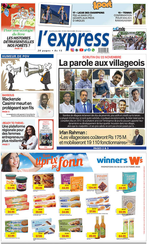 En une de l'express : Scrutin du 22 novembre: la parole aux villageois ; Autre titre : Irfan Rahman : «Les villageoises coûteront Rs 175 M et mobiliseront 19 110 fonctionnaires».