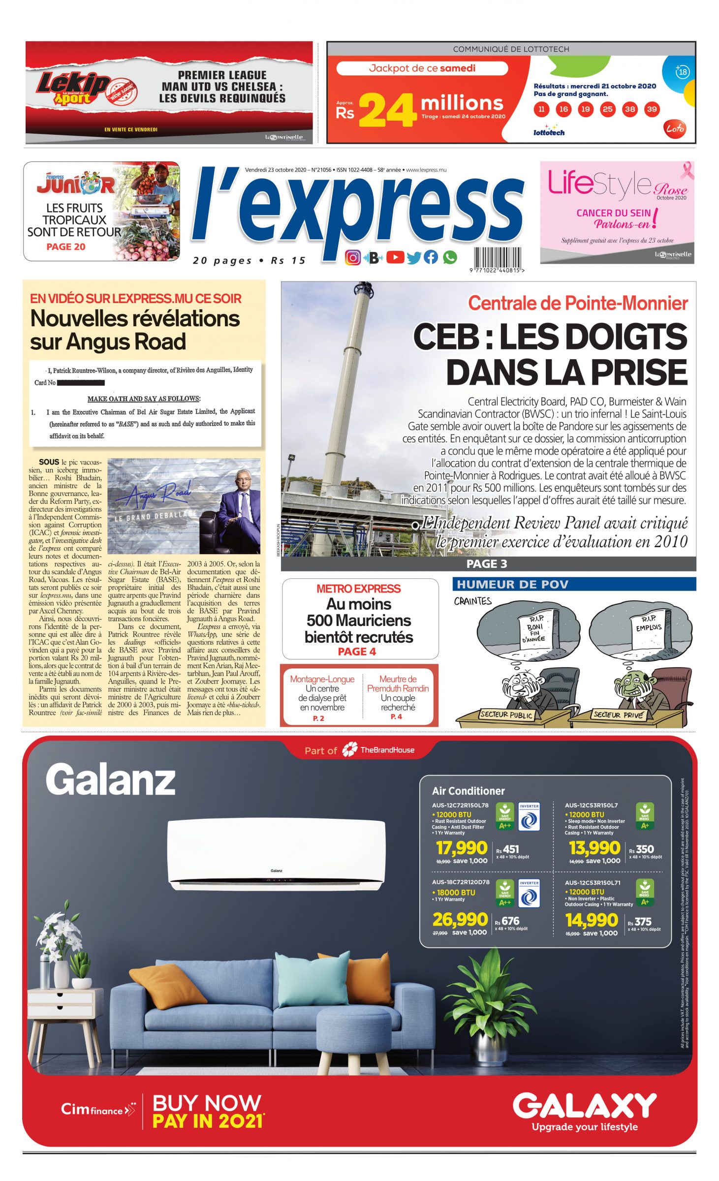 En une de l'express : CEB: les doigts dans la prise ; Autre titre : Nouvelles révélations sur Angus Road