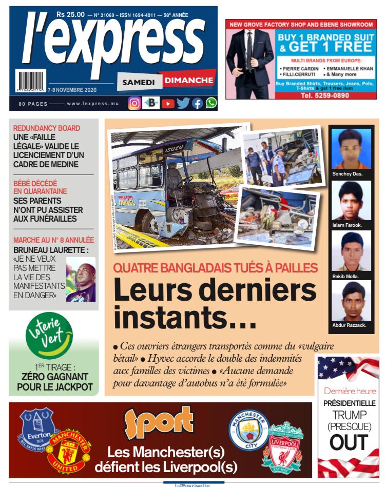 Votre journal deux en un de 80 pages en vente tout le week-end est en kiosque. Au coeur de l'actualité: Quatre bangladais tués à Pailles: Leurs derniers instants. Autre titre ; Marche au n° 8 annulée, Bruneau Laurette : «je ne veux pas mettre la vie des manifestants en danger»