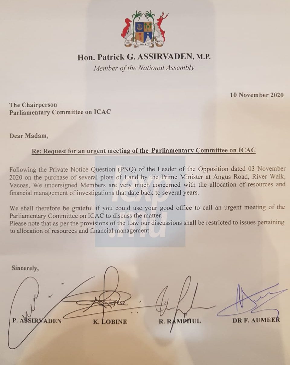 «Soyez rassurée que, tel que le préconise la loi, nos discussions ne seront qu’axées qu’aux questions de ressources et de gestion financière de l’ICAC,» écrivent, Patrick Asirvaden, Kushal Lobine, Ritesh Ramphul, et le Dr Farhad Aumeer.